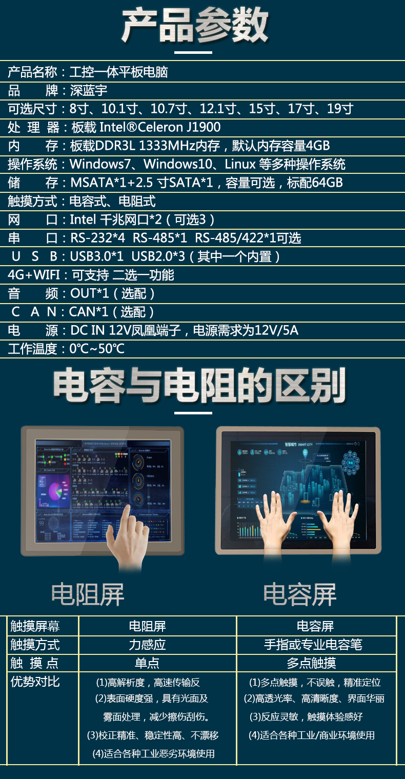 ±¾»ú²ÉÓÃIntelµÍ¹¦ºÄ´¦ÀíÆ÷——Intel®Celeron J1900£¬°åÔØ4GB DDR3L 1333MHzÄڴ棬´îÅä19´ç”·Ö±æÂÊΪ1280*1024µÄTFTÏÔʾÆÁ£¬µçÈÝʽ´¥ÃþÆÁ£¬Ö§³Ö¶àµã´¥¿Ø¡£Ö§³Ö12V~24VÖ±Á÷¿íѹ¹©µç£»Ö§³ÖmSATAÓë2.5´çSATA3.0Ë«´æ´¢£»¼¯³ÉÁ˷ḻµÄ I/O ½Ó¿Ú£¬4*RS-232£¬1*RS-485£¬ÁíÍâÓÐ1*RS-232/485/422¿ÉÇл»´®¿Ú£¬2 *LAN£¨3*LAN¿ÉÑ¡£©ºÍ4*USB2.0£¨ÆäÖÐÒ»¸öÄÚÖã©£¬1*USB3.0£¬1*SPK£¬´ø¹âñî¸ôÀëËĽøËijöµÄGPIO£¨GPIO¹¦ÄÜ¿ÉÑ¡£©£¬»¹Å䱸Á˼«¾ßÌØÉ«µÄÒ»¼ü±¸·ÝÓëÒ»¼ü»¹Ô°´Å¥£»Ö§³Ö4G»òWiFi¡£